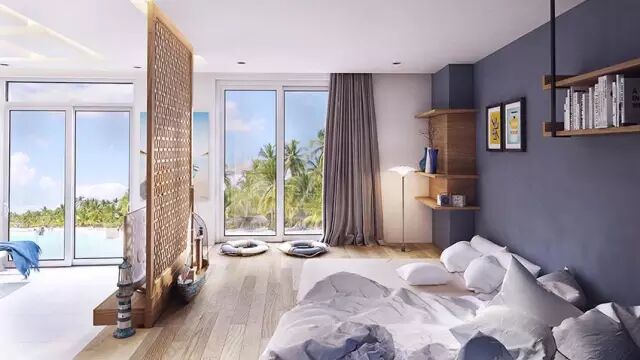 卧室区域的墙面为深蓝色,显得冷静神秘,利于入眠。木质地板显出自然气息,落地窗边的游泳圈带来轻松的假日心情,加上主卧两面临窗采光效果极佳,整个空间就更加明亮且温馨,多了一份悠闲生活的情趣!