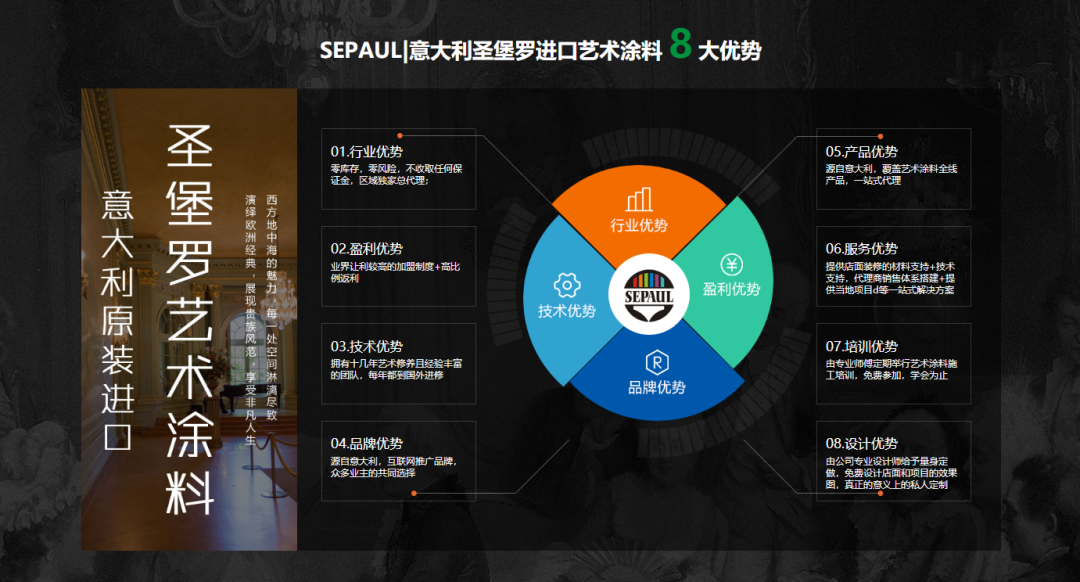 投资者在选择艺术涂料加盟品牌的时候,还要看看该加盟品牌对加盟商的扶持是否全面,投资圣堡罗加盟店,圣堡罗总部会对加盟商进行专业的免费培训技术,指导作业,使合作商无后顾之忧的开展工作;总部提供门店形象设计;提供装修补贴支持;你只需针对客户的开发和维护,就能有属于自己的事业;与此同时,圣堡罗品牌还深度接入互联网媒体广告推广,获客销售资料,配套色卡样本册无需担心客户问题;还有强大的培训团队,手把手教学。你还在犹豫什么,赶紧来吧!